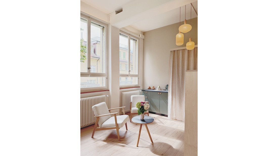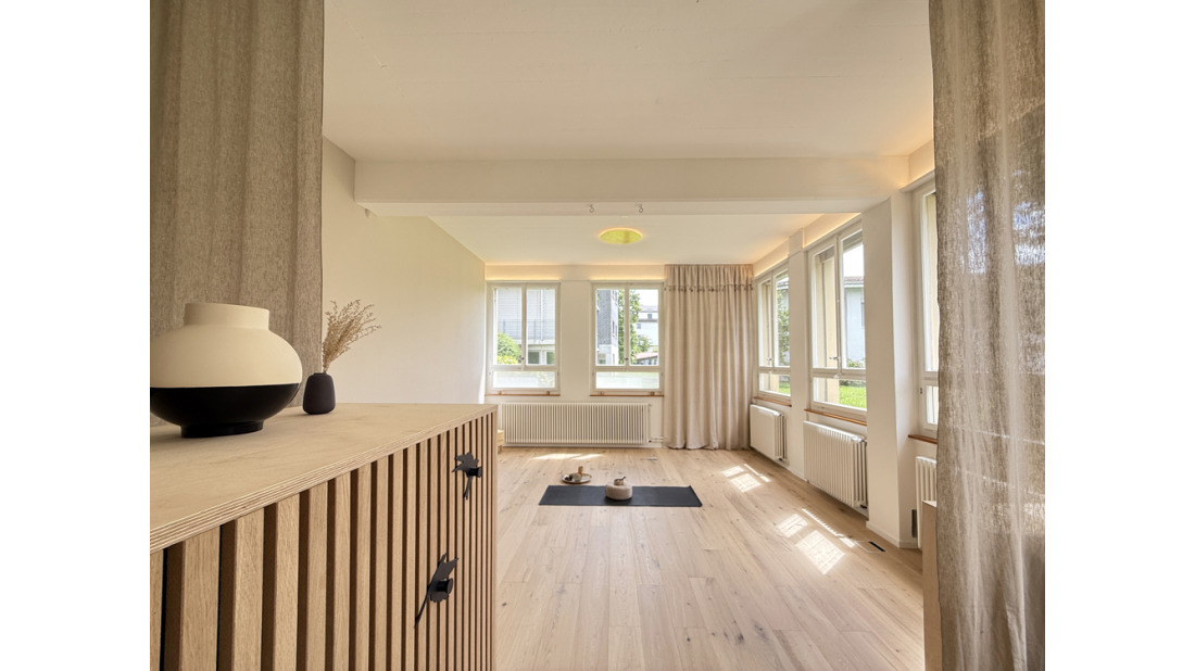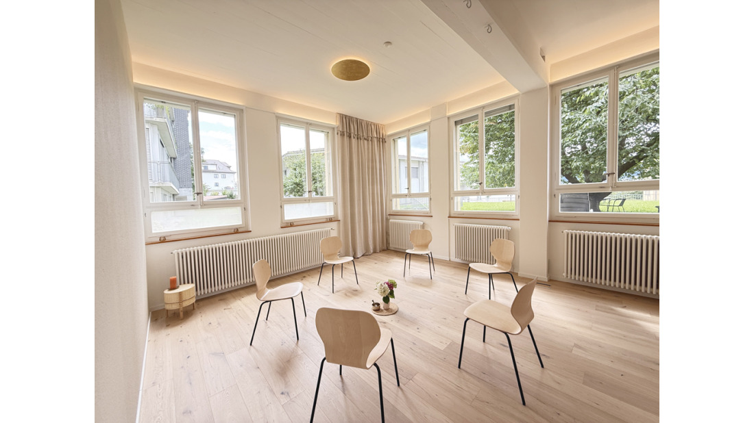 47 m² lichtdurchfluteter, frisch renovierter Coaching- und Therapieraum mit 3.50 m Deckenhöhe und Blick ins Grüne. Warme Naturtöne, edles Eichenparkett und sieben Fenster schaffen eine ruhige, hochwertige Atmosphäre – ideal für Coaching, Therapie, Yoga, MBSR und achtsame Gruppen bis 8 Personen.