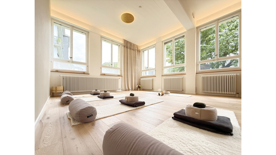 Der Raum ist voll ausgestattet: Yogamaterial, Meditationskissen, Stühle, zwei Coaching-Sessel sowie eine kleine Garderobe und Teebar stehen zur Verfügung.