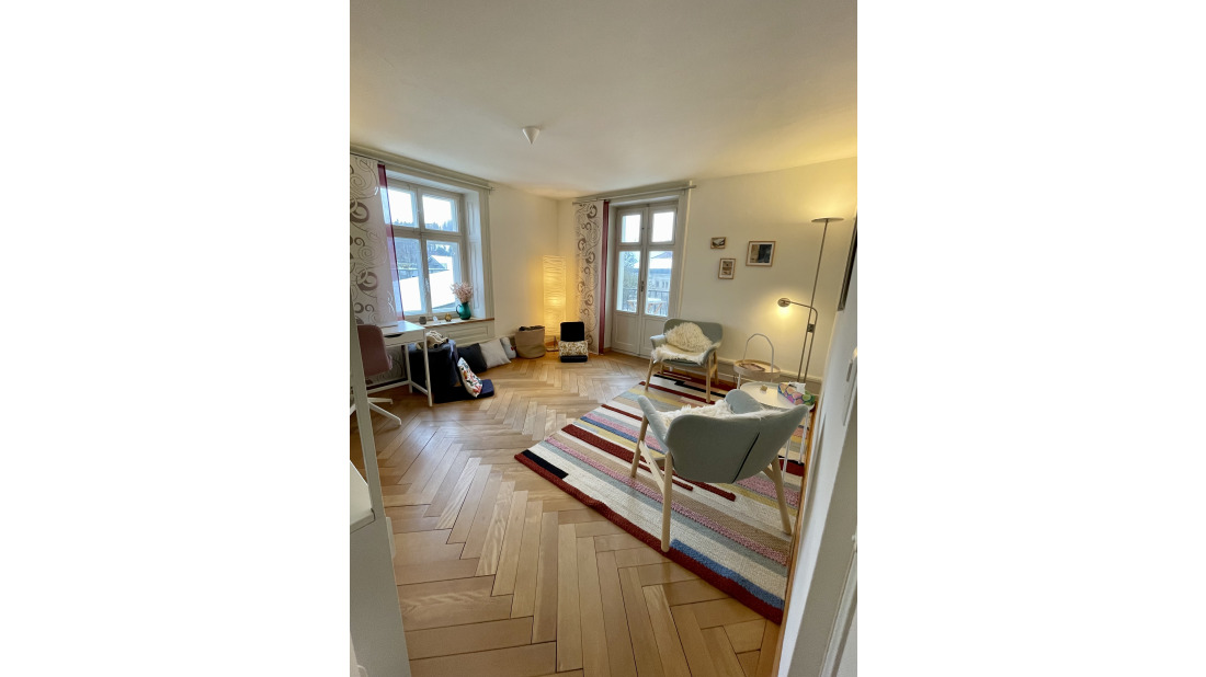 Der Raum ist ca. 18 m2 gross, unmöbliert (auf Wunsch können jedoch einige Möbel der Vormieterin übernommen werden) und kostet bei Vollzeitnutzung 467.- (Akonto NK). Er verfügt über einen direkten Zugang zum Balkon.