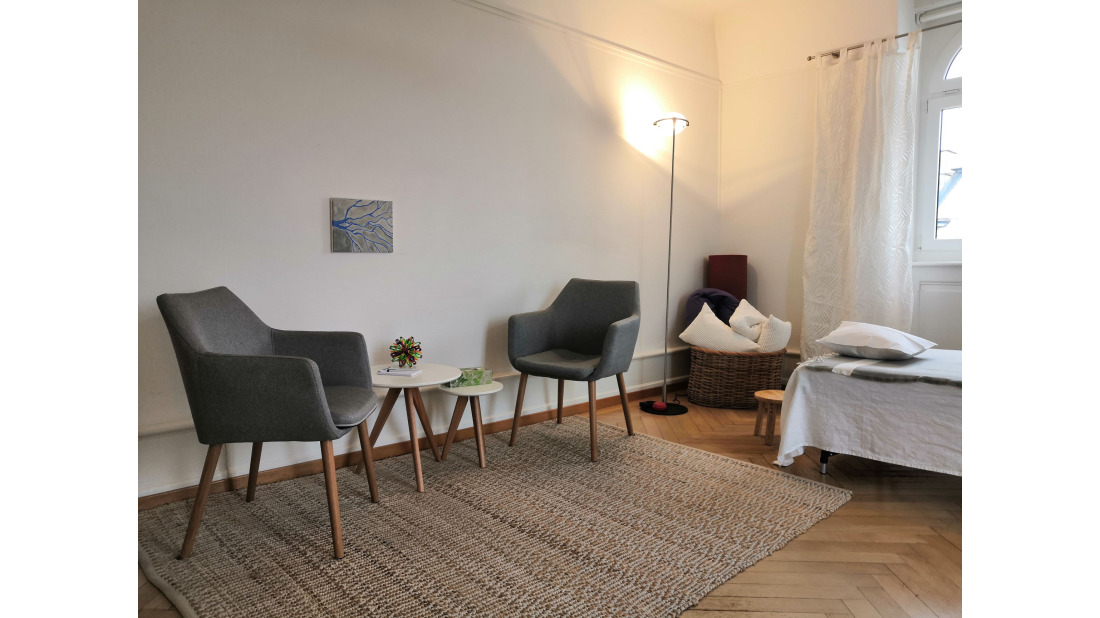 Der Raum hat ca. 20qm, befindet sich im 3.Stock., ist mit einer Sitzecke für Gespräche und einer Behandlungsliege möbliert. Im Haus befinden sich weitere Psychotherapeutische Praxen mit sehr gutem Nachbarschaftsverhältnis.